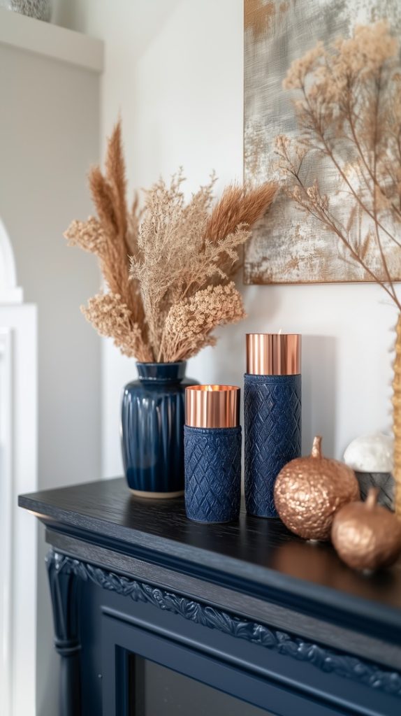 A sleek and modern fall console display features a stylish combination of blue and copper tones. The dark blue vases, filled with dried fall grasses, bring a natural autumn touch, while the copper accents add a touch of warmth and elegance. The minimalist design of the console is complemented by seasonal decor, creating a chic and sophisticated look that’s perfect for modern homes looking to embrace fall without overwhelming the space.