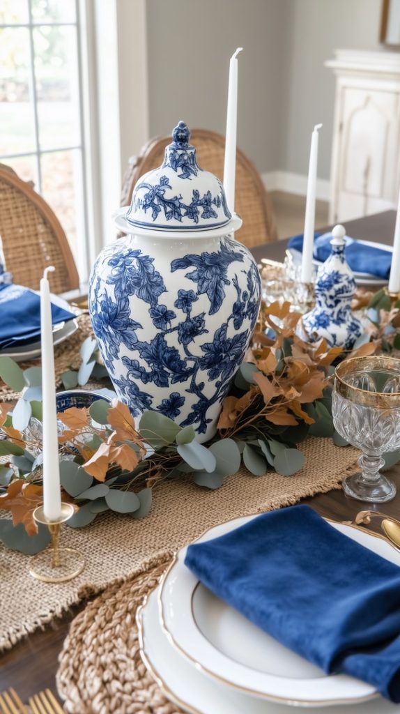 This elegant fall table setting pairs classic blue and white china with seasonal autumn touches. A large blue ginger jar serves as the focal point, surrounded by eucalyptus branches and white pumpkins. The woven placemats and blue napkins add texture and depth to the table, making it ideal for hosting cozy fall dinners. The contrast of cool blues with the natural tones of fall foliage creates a sophisticated yet inviting atmosphere.