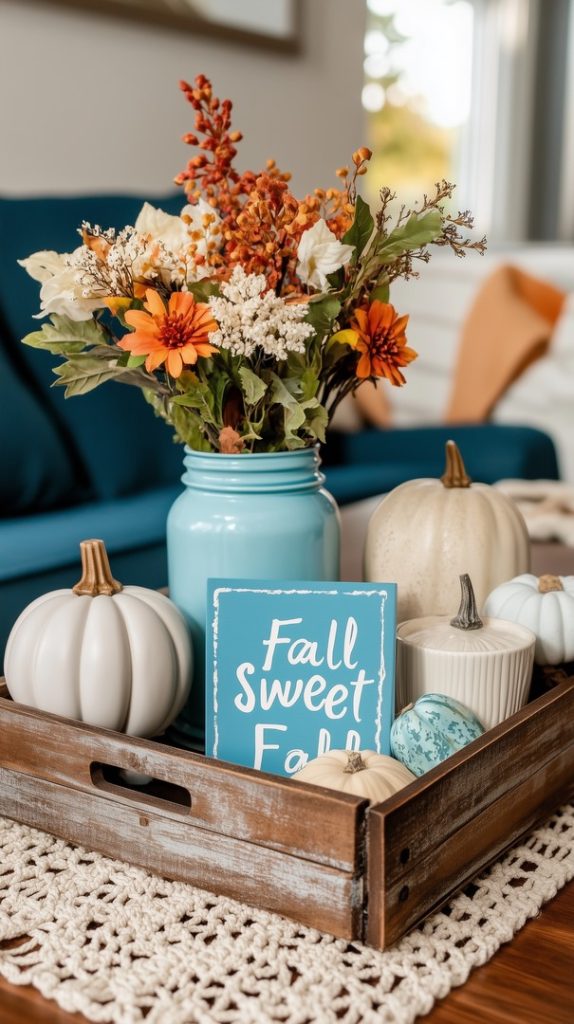 A cozy living room styled for fall features a rustic tray with a blue mason jar vase filled with seasonal flowers. The setup is completed with mini white pumpkins and a charming fall sign, adding a seasonal touch to the space. The rich blue tones of the vase pair beautifully with the natural wood and warm beige hues, creating a comfortable and inviting space perfect for autumn gatherings or relaxing by the fireplace.