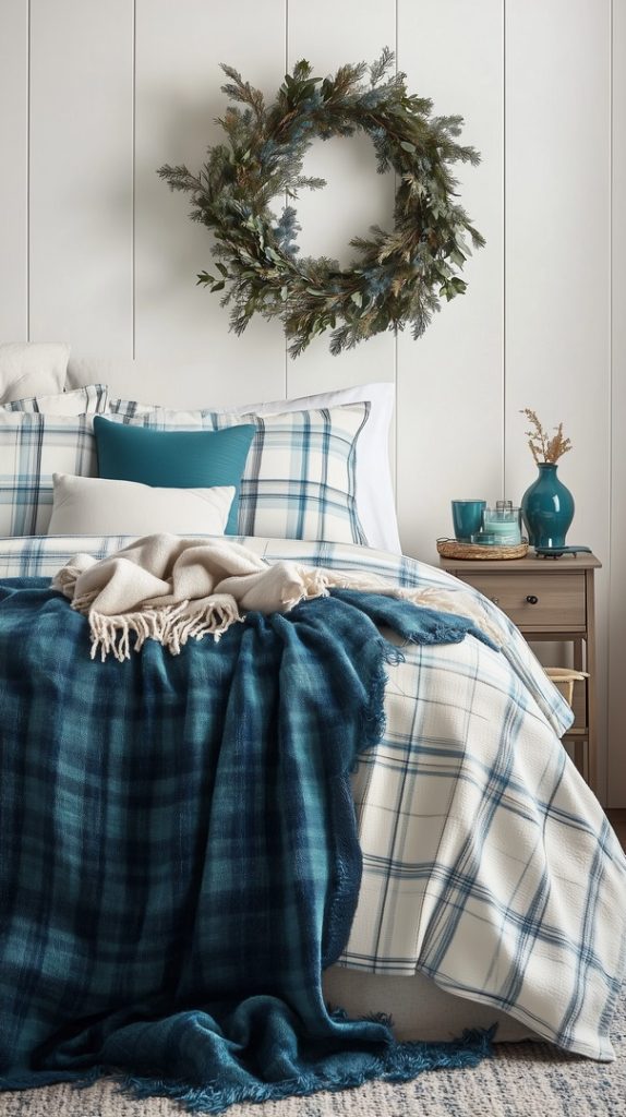This bedroom embraces fall with plaid bedding in shades of blue and a lovely wreath hung above the bed. The layered textiles create warmth, making the space feel both rustic and inviting for the autumn season.
