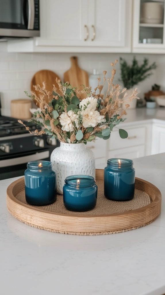 This kitchen fall decor brings together soft neutrals and deep blues. A round wooden tray holds blue candles and a white vase filled with seasonal blooms. The combination of natural wood and sleek blue accents adds a touch of modern elegance to the space, making it feel fresh yet cozy. This minimalist yet impactful fall decor blends seamlessly into a neutral kitchen, offering a subtle nod to the season without overpowering the space.
