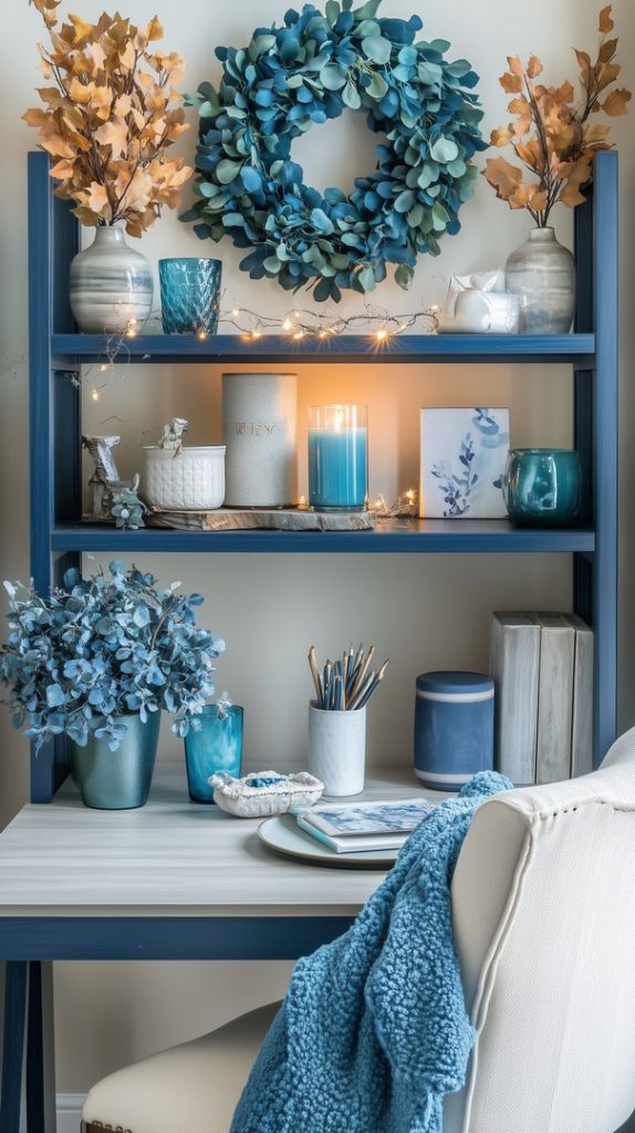 A beautifully styled bookshelf with blue vases, soft fall wreaths, and candles. This decor idea emphasizes a balance of modern elegance and fall coziness, making it perfect for a living room or study space.