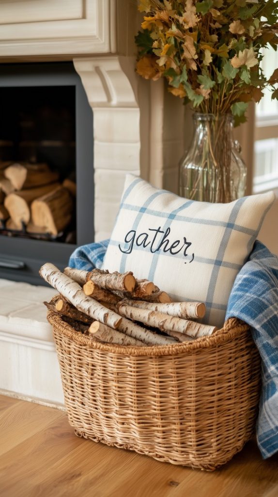 This living room corner brings in the fall spirit with a woven basket filled with plaid blankets and pillows. The “Gather” pillow adds a welcoming touch, while the blue and white plaid complements the natural tones of the basket. Styled next to a fireplace with fall foliage in a glass vase, this setup radiates warmth and comfort, perfect for cozying up during the fall season. The balance of blue tones with natural textures creates a relaxed yet styled space.