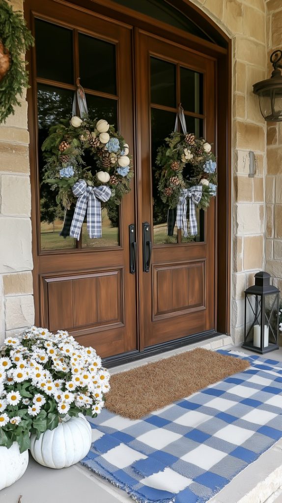 A welcoming fall entryway featuring blue plaid accents and soft neutral tones. The front door is adorned with a seasonal wreath made of dried fall leaves and flowers, complemented by a blue plaid doormat. White pumpkins and fall flowers in wicker baskets complete the look, offering a charming and rustic touch to this fall-inspired doorway. The combination of blue tones and natural elements creates an inviting and festive atmosphere perfect for greeting guests.