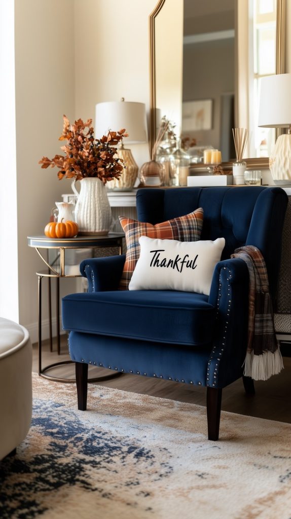 This luxurious living room embraces autumn with a bold blue velvet armchair, accented by a “Thankful” pillow. The room is styled with a modern yet cozy vibe, featuring a side table adorned with a seasonal floral arrangement in shades of orange and beige. The rich blue tones combined with autumnal accents create a sophisticated and warm space perfect for unwinding during the cooler months, making it both inviting and stylish.