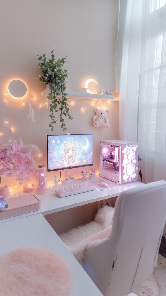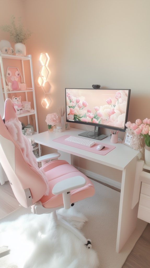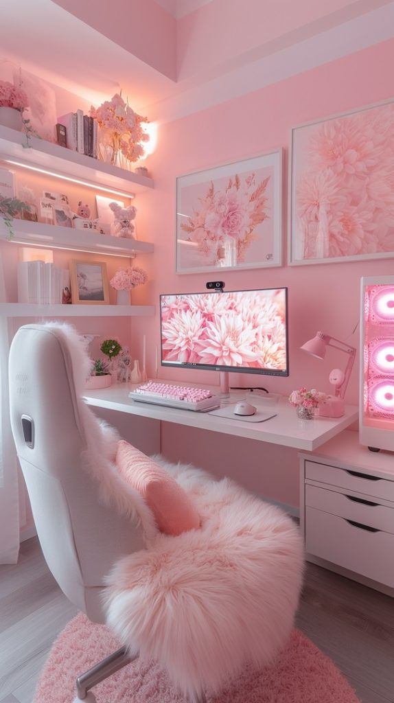 This room embraces a delicate pastel color palette, featuring a soft pink chair, white furniture, and cozy accents that create a calm and relaxing atmosphere. The combination of the fluffy rug, soft lighting, and neutral walls makes it an ideal space for gamers who prioritize comfort. It’s the perfect setup for long gaming sessions, blending a warm, homely vibe with a touch of femininity.