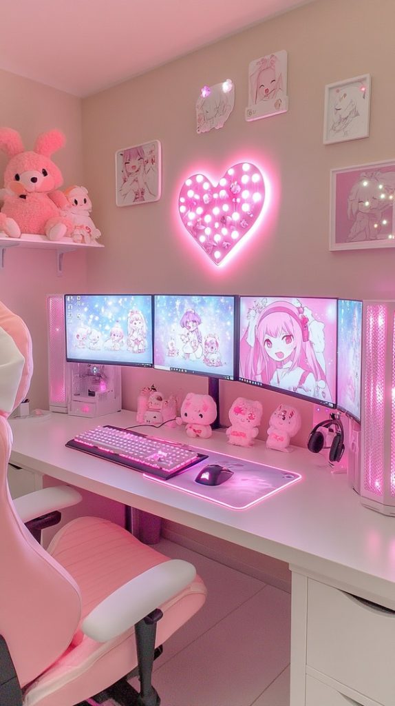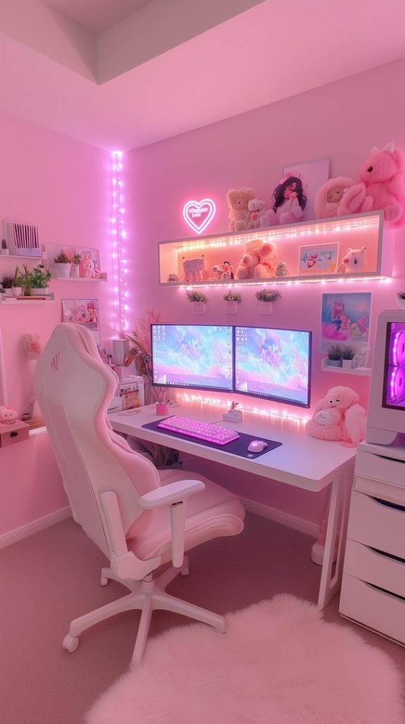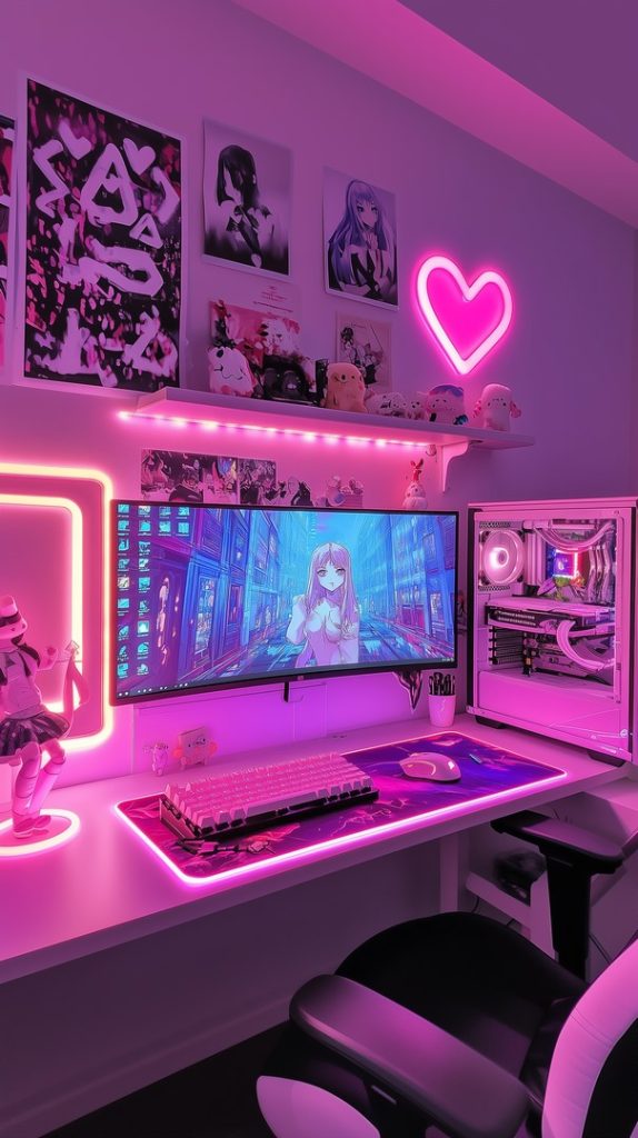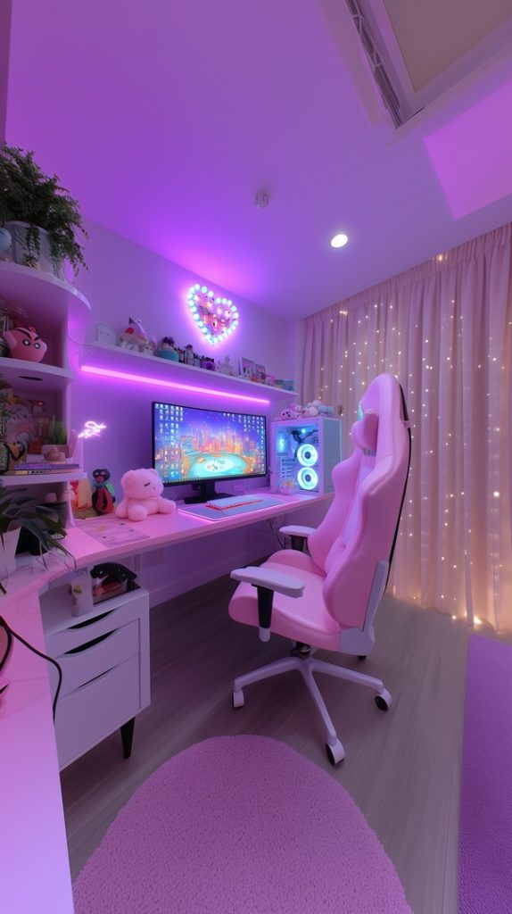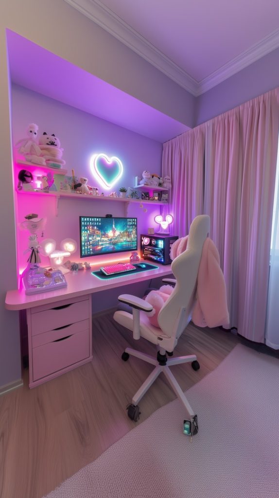 With a neon heart glowing on the wall and playful pink lighting throughout, this gaming room is all about fun. It’s the ideal setup for someone who wants a bright, cheerful space that reflects their energetic personality and love of gaming.