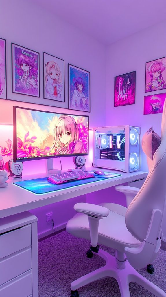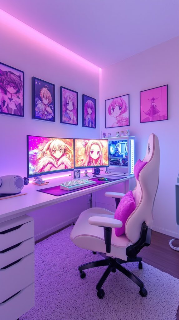 Filled with anime posters, bright neon lights, and a vibrant color palette, this room captures the energy and fun of anime culture. It’s a dream come true for anime enthusiasts who want to incorporate their love for the genre into their gaming space. With walls covered in favorite characters and bright, animated lighting, this room feels alive and dynamic.