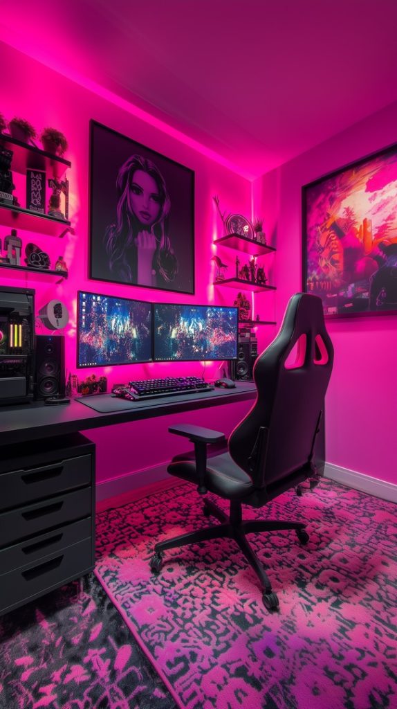 Designed to maximize space without compromising on style, this gaming room features a chic pink color palette and a clean, compact setup. The simple design allows for efficiency, while the pink accents ensure that the room remains stylish and feminine. It’s ideal for gamers who want a functional yet aesthetically pleasing gaming area.