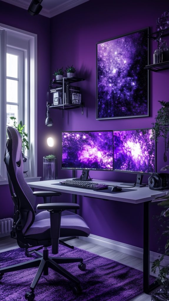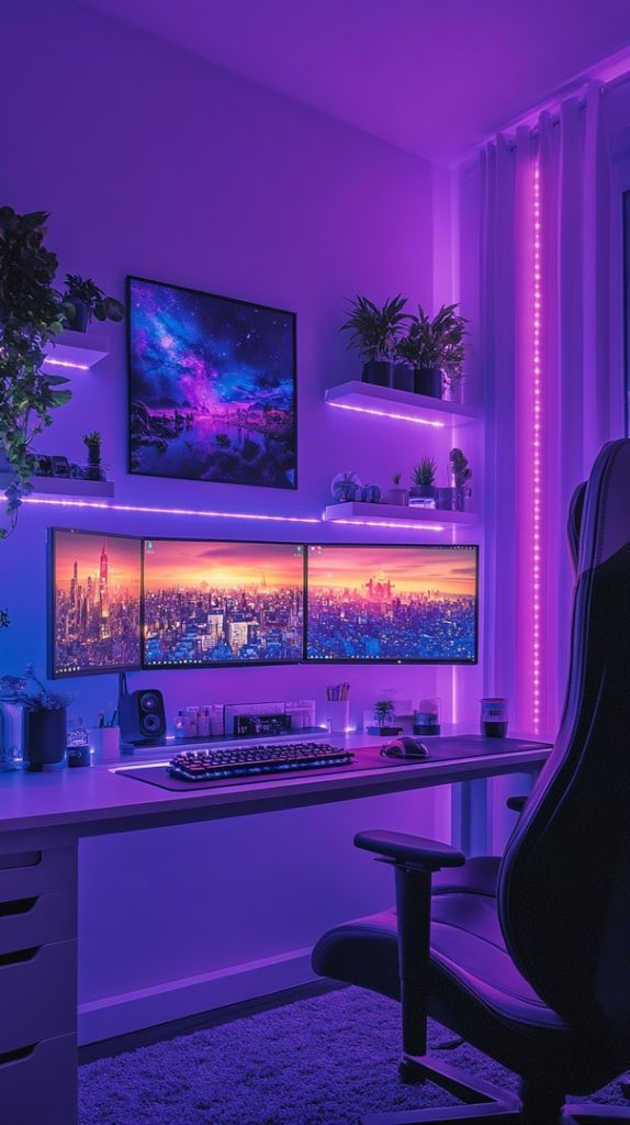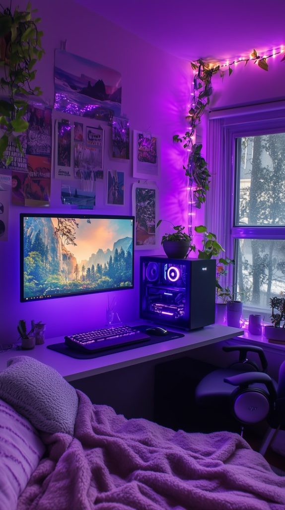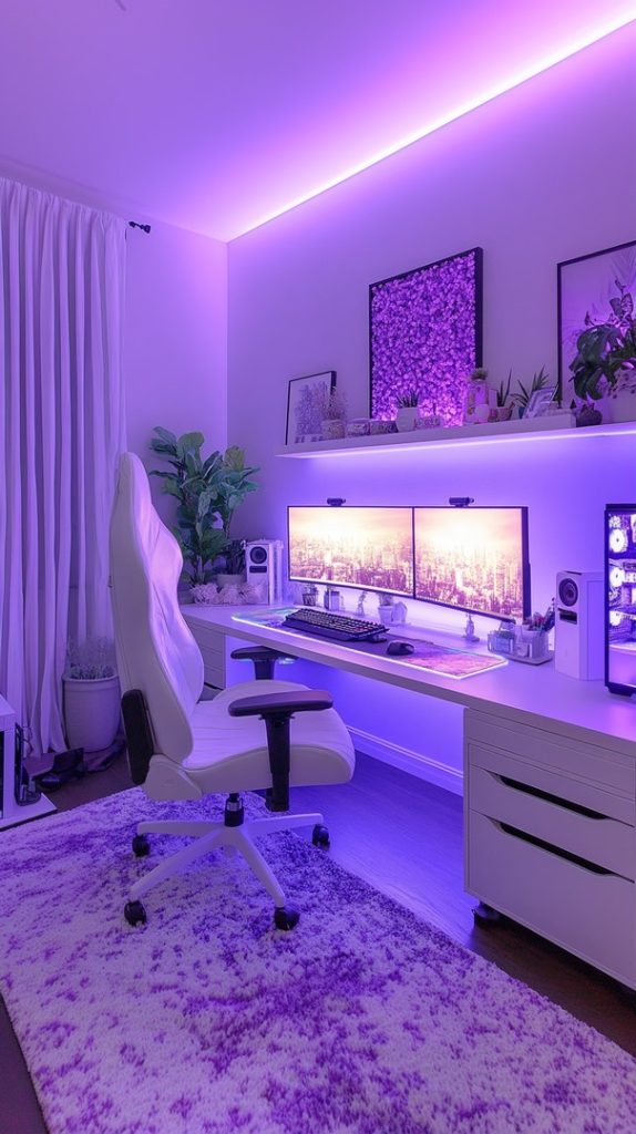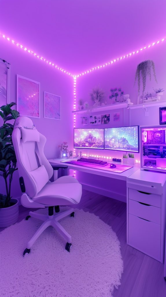 A minimalistic design with a soft purple glow, this room is perfect for gamers who prefer simplicity without sacrificing style. The white desk and walls serve as a clean backdrop for the purple LED lights that set a relaxing tone. The uncluttered environment helps to keep the focus on gaming, while the subtle lighting creates a calm, soothing space for late-night sessions.