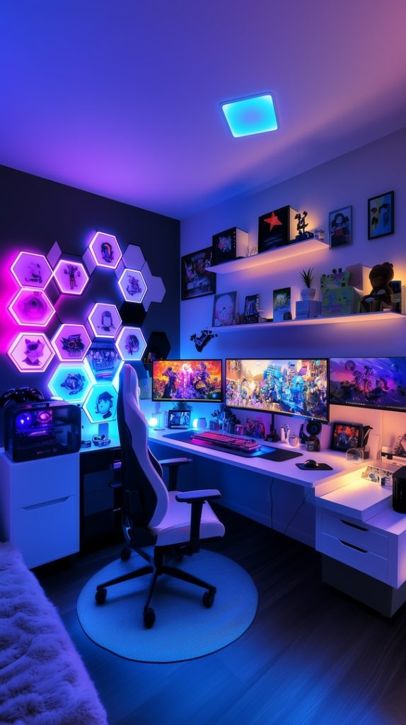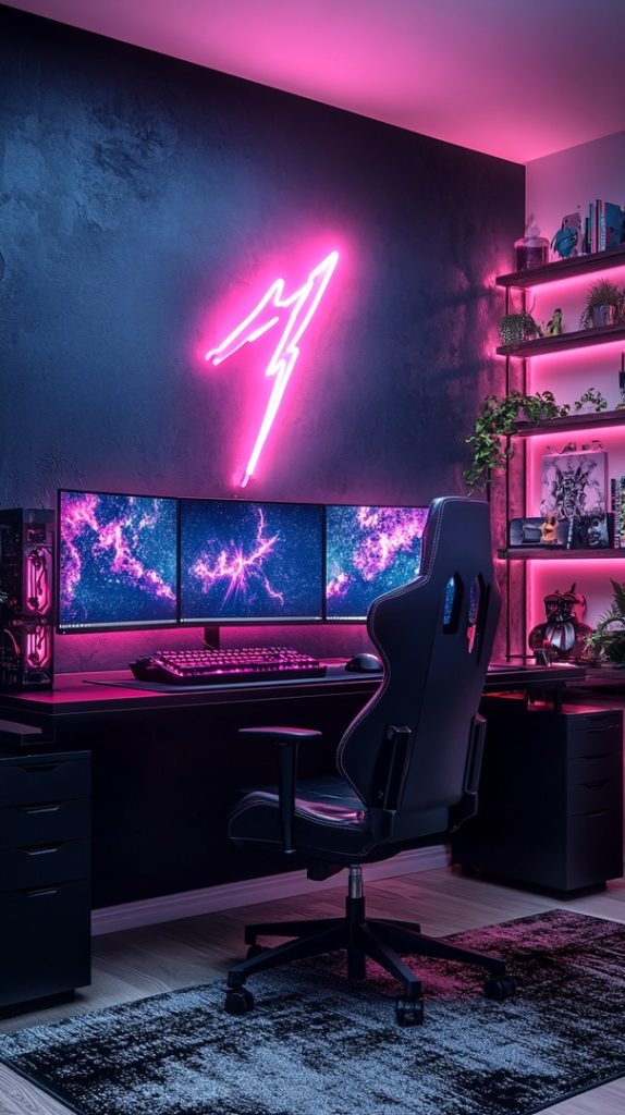 This room’s standout feature is its circular neon wall art, which adds a modern and playful touch to the space. The pink lighting creates a soft glow, giving the room a fun yet relaxed vibe. With its mix of futuristic decor and cozy furniture, it’s a gaming setup that blends style and functionality seamlessly.