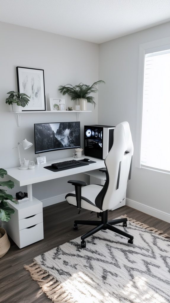 This minimalist setup emphasizes a clean, modern look with its black-and-white color scheme. The white furniture and walls create a fresh, open feel, while the black gaming chair and accessories add a touch of sophistication. This setup is perfect for gamers who love a sleek, clutter-free environment that promotes focus and productivity.