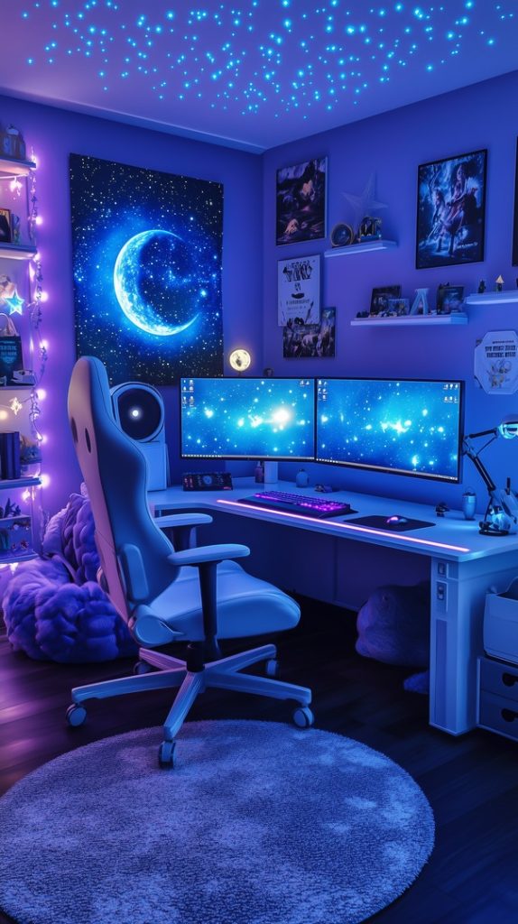 This gaming room is straight out of a dream, with its blue lighting and moon-shaped decor creating a serene, magical atmosphere. The starry ceiling and cool blue tones make it feel like you’re gaming under the night sky, adding a peaceful and immersive experience to every session.