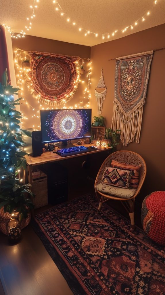 With its warm earthy tones, woven rugs, and cozy seating, this room brings a bohemian vibe to a high-tech gaming setup. The fairy lights and tapestries add a whimsical touch, making it a unique and inviting space for those who want a more laid-back, eclectic gaming environment.