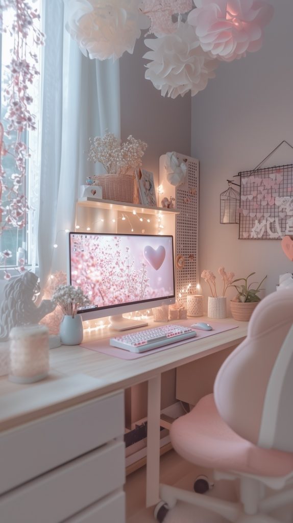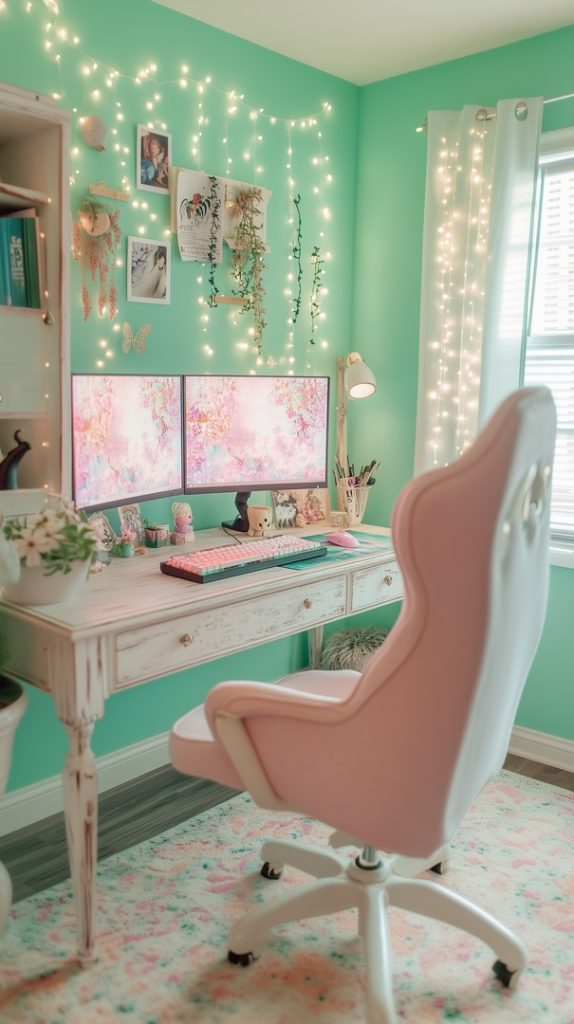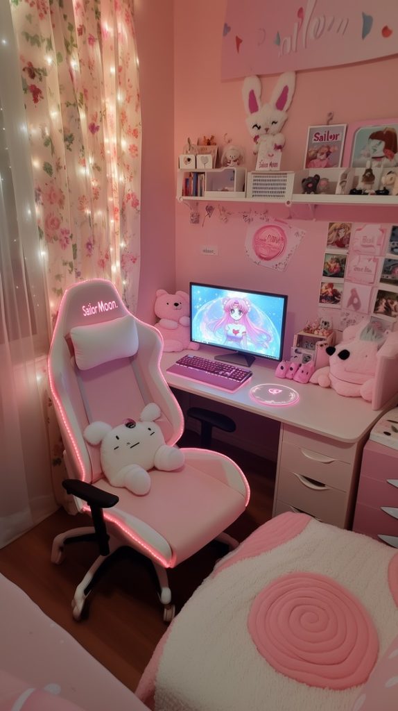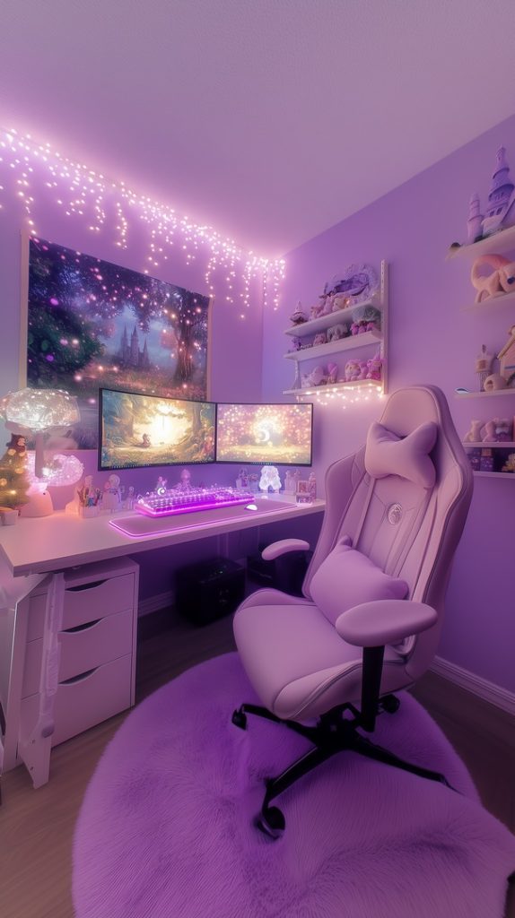 This dreamy setup is adorned with delicate fairy lights and soft pink hues, creating a magical and elegant space. The comfortable seating and calming lighting make it perfect for long gaming sessions where comfort and style go hand in hand.