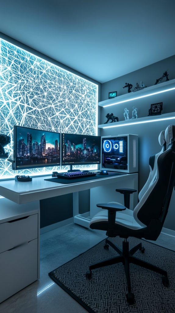 With its sleek blue lighting and high-tech equipment, this room feels like a futuristic gaming paradise. The cool tones and glowing lights create a calm, high-performance environment perfect for gamers who want their space to reflect their love of advanced technology.