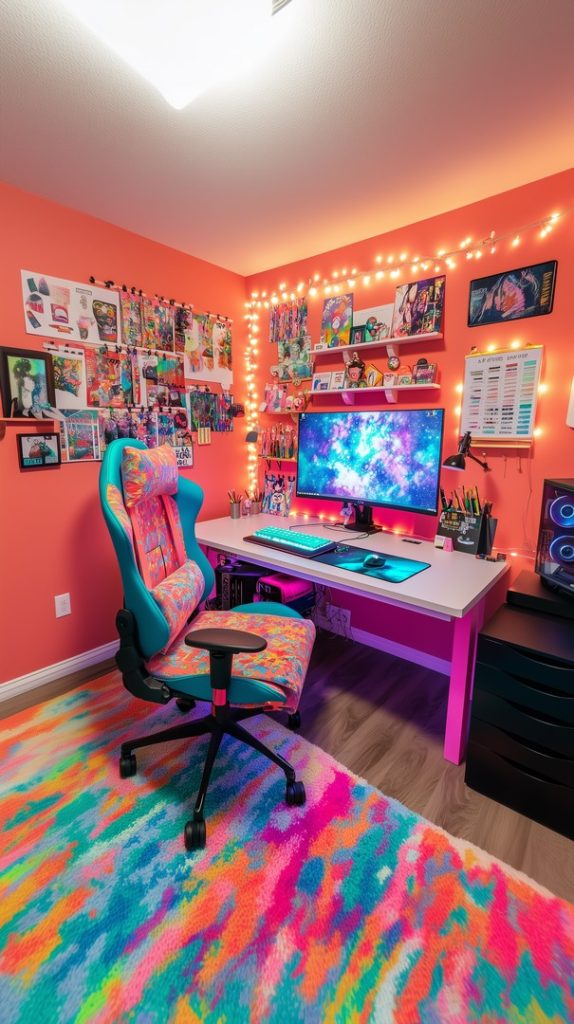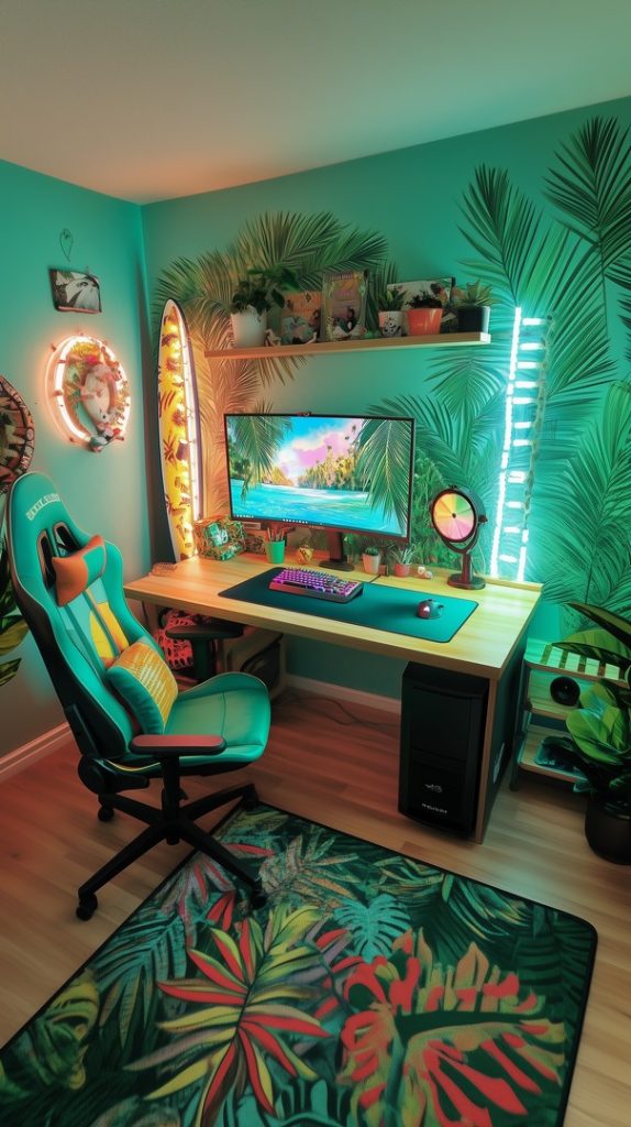Bringing a tropical twist to the gaming world, this room combines bright green and pink accents with playful decor to create a fun and lively space. It’s a bold and energetic setup, perfect for a gamer who loves vibrant colors and a bit of island flair.