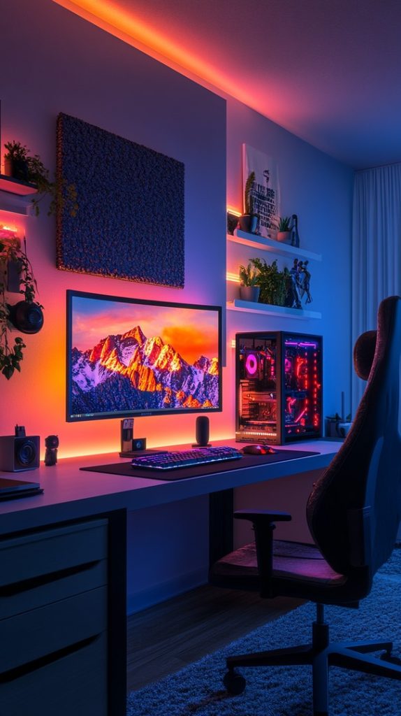 This room combines soft, golden lighting with neutral tones to create a warm and inviting gaming space. It’s perfect for gamers who love a cozy, homey environment where they can relax and enjoy long gaming sessions in comfort.