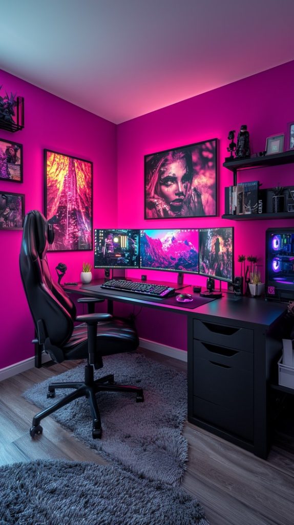 Vibrant and bold, this room turns heads with its hot pink and magenta color scheme. The dynamic lighting, along with the pink-themed furniture and tech, creates a striking atmosphere that’s impossible to ignore. It’s an energetic space perfect for gamers who love powerful, in-your-face decor and want their gaming room to reflect their fierce personality.