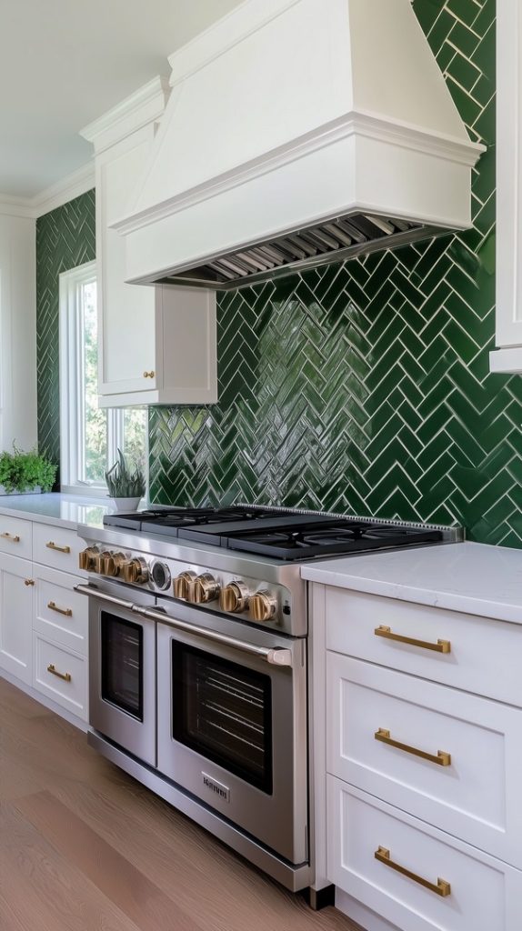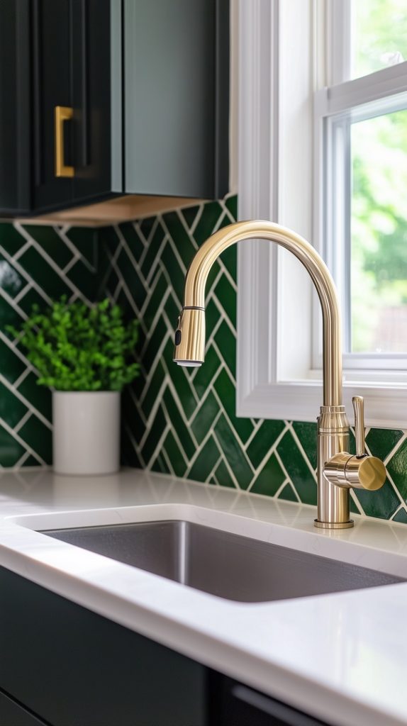 This kitchen features a beautiful green chevron tile backsplash that adds both color and movement to the space. The sleek design is complemented by the clean, white countertops and brass fixtures, offering a contemporary vibe with a touch of sophistication. The glossy green tiles reflect light, making the kitchen feel open and fresh, while the chevron pattern brings a modern twist to a classic color scheme.
