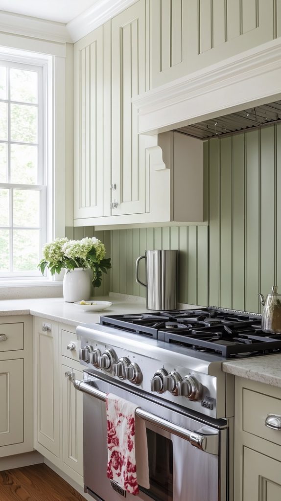 Soft Sage Green Vertical Panels for a Country Kitchen