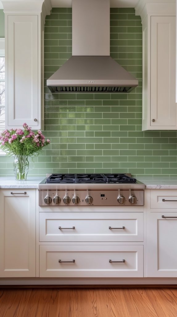 A warm green backsplash paired with classic white cabinetry gives this kitchen a timeless yet trendy look. The smooth tiles are arranged in a simple, elegant pattern, providing a subtle backdrop to the more traditional elements of the kitchen. This design blends modern colors with traditional forms, making it ideal for those who love a mix of old and new. The green hue warms up the space, making it both stylish and cozy.