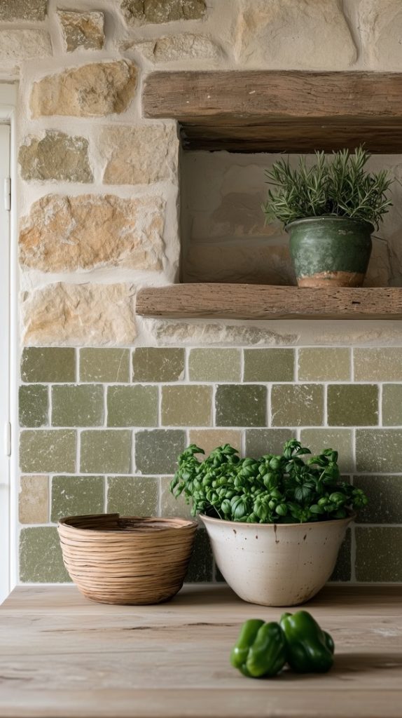 Rustic Green Backsplash with Stone Accent Shelves
