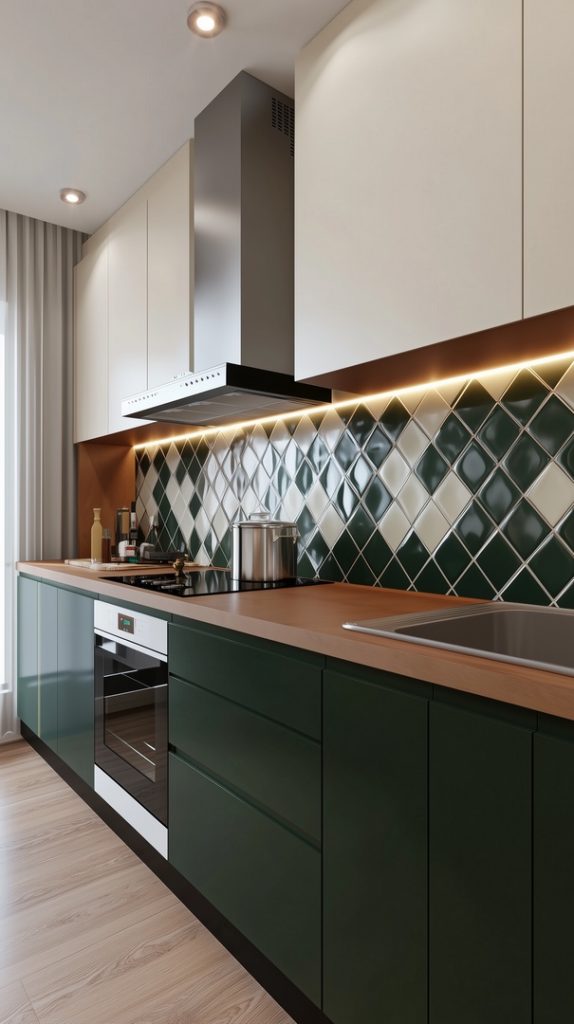 Green and Neutral Toned Diamond Pattern Backsplash