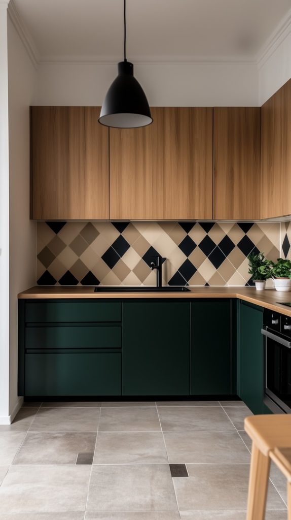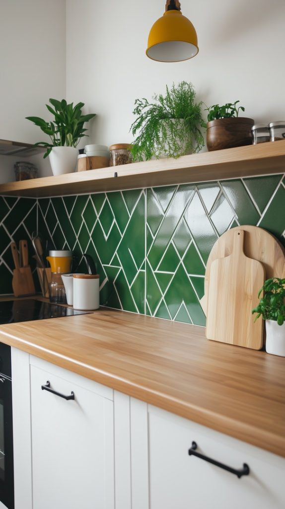Geometric Green Backsplash with Wooden Countertops