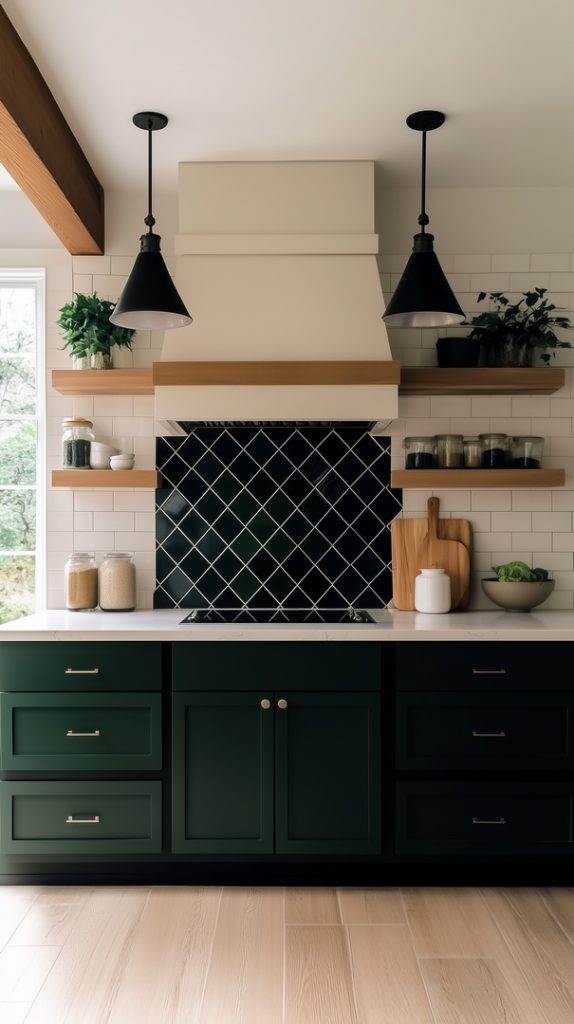This kitchen highlights the timeless appeal of dark green subway tiles, offering a bold yet elegant design. The glossy finish of the tiles reflects light beautifully, creating a sense of depth and luxury. The dark green pairs perfectly with the black and white color palette, making this backsplash an excellent choice for a contemporary or transitional kitchen. It’s a sophisticated design that makes a strong statement without overwhelming the space.