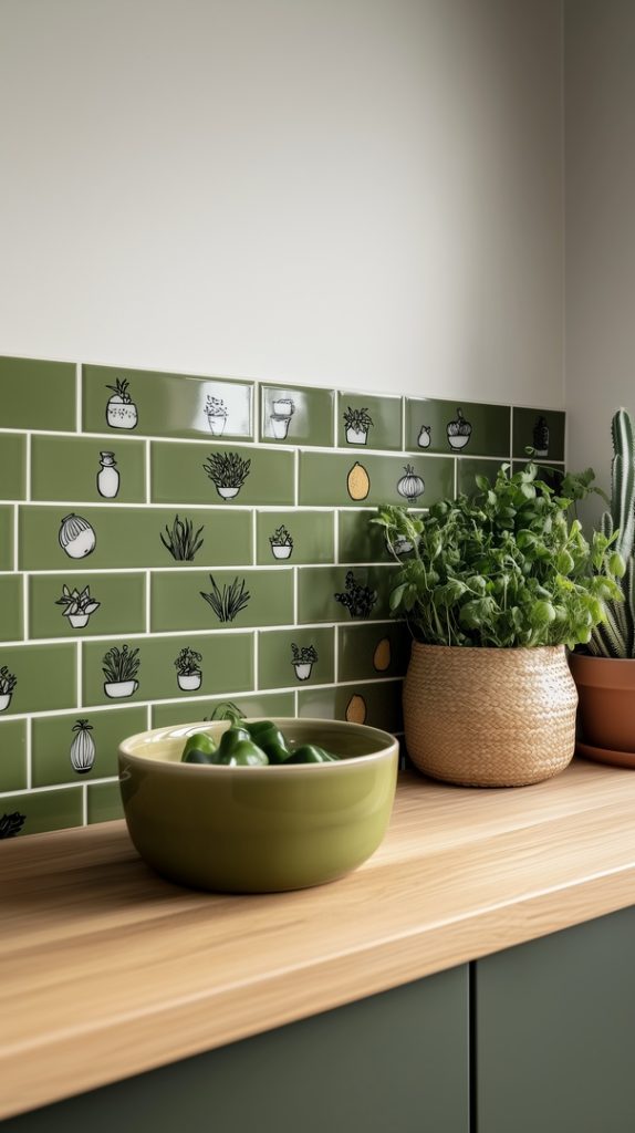 Botanical Green Tile Backsplash with Leaf Patterns