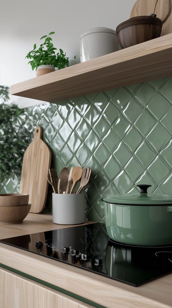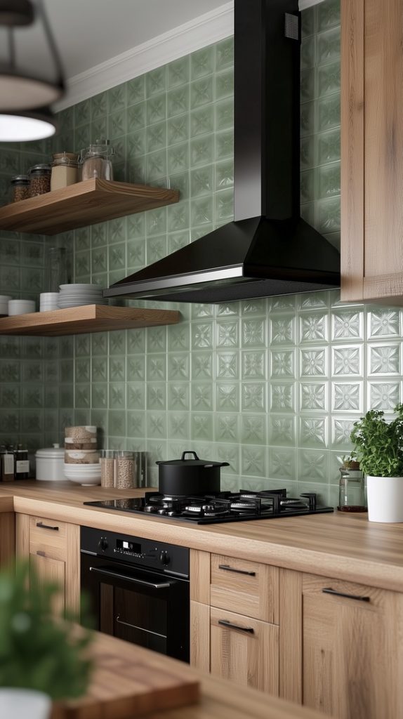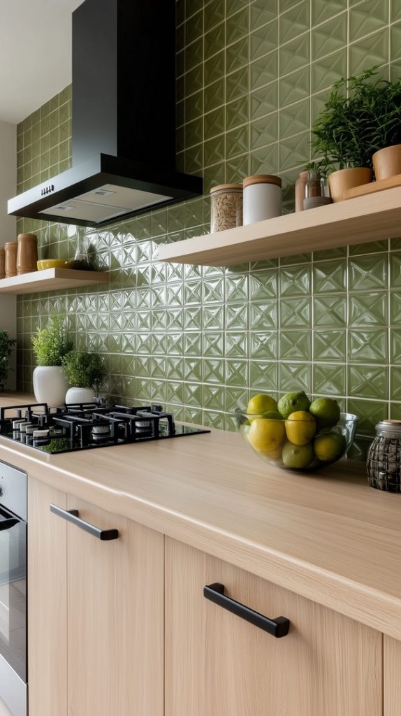 This kitchen design features textured green tiles that add dimension and interest to the space. The natural wood accents provide warmth and contrast to the cool green tones, creating a balanced and inviting environment. The combination of textured tiles and organic materials makes this kitchen both modern and cozy, perfect for anyone looking to add a unique, nature-inspired touch to their home.