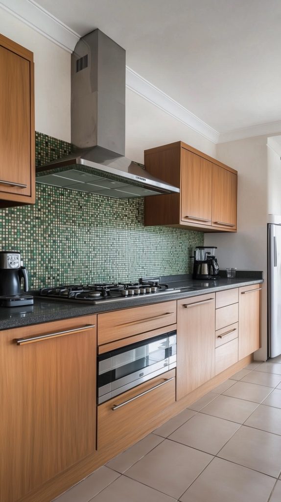 Sleek Green Tiles with Natural Wood Cabinets