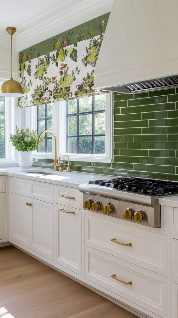 This kitchen radiates elegance with its shimmering green tiles and brass hardware accents. The green backsplash, in a deep jewel tone, creates a luxurious atmosphere, while the brass details add a touch of sophistication. The combination of glossy green tiles and rich, warm metals elevates the kitchen, making it a perfect space for those who appreciate a blend of classic and contemporary design elements.