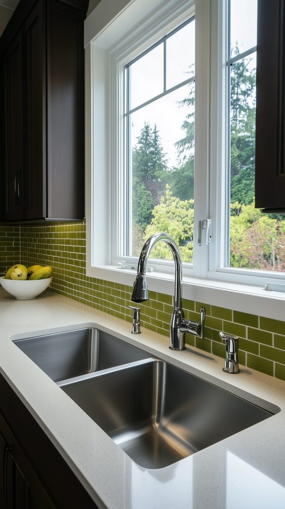 This kitchen’s bold green backsplash is perfectly framed by natural light, creating a vibrant and welcoming space. The mix of dark and light green tiles adds depth and dimension to the design, while the neutral cabinets keep the focus on the vibrant backsplash. Paired with stainless steel appliances and minimal decor, this backsplash becomes the centerpiece of a sleek, modern kitchen.