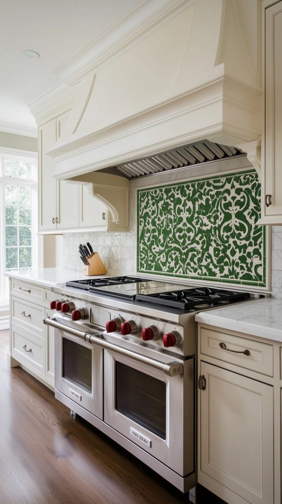 This vibrant kitchen features a striking green tile backsplash with intricate patterns that immediately draw the eye. The bold contrast between the green tiles and the white countertops provides a refreshing take on a modern kitchen design. The pattern’s complexity adds texture and depth, making this backsplash both functional and decorative. Paired with sleek white cabinets and stainless steel appliances, this kitchen strikes the perfect balance between classic elegance and contemporary style.