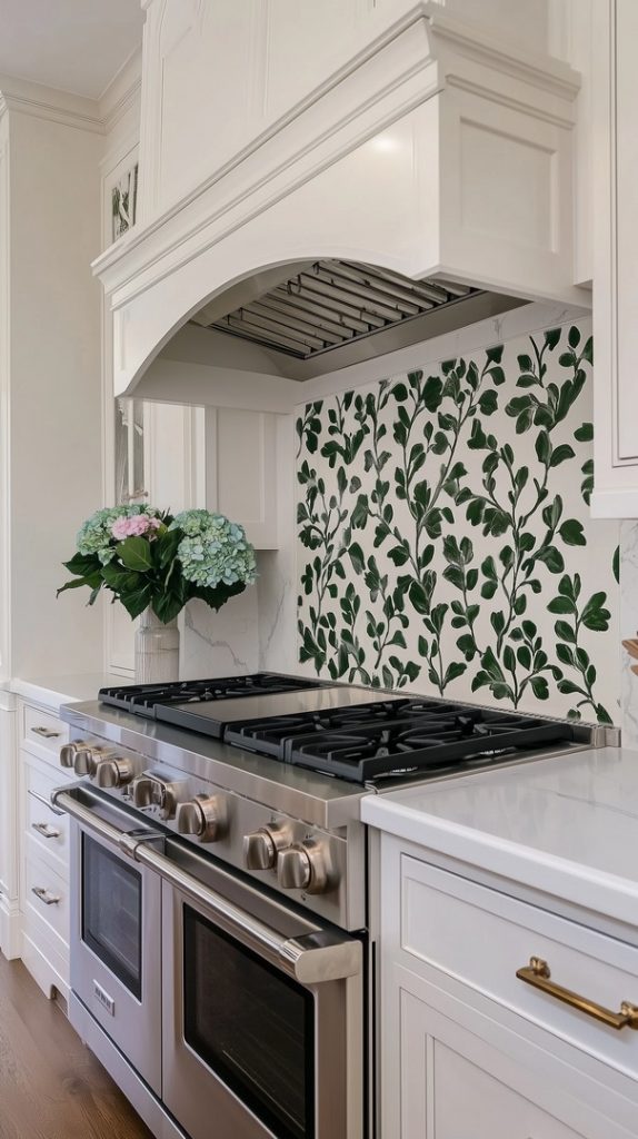 Embrace the natural beauty of this kitchen with its botanical-themed green tile backsplash. The intricate leaf pattern in different green tones adds a whimsical touch while maintaining a sophisticated look. Paired with classic white cabinetry and modern appliances, the backsplash stands out as a statement piece, adding both texture and nature-inspired design to this elegant kitchen.