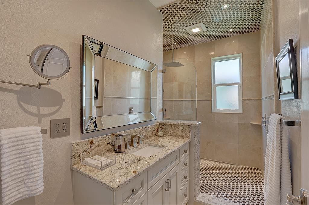 This bathroom combines luxury and functionality with a sophisticated design. The vanity features a light-colored granite countertop with subtle brown and gray speckles, paired with white cabinetry that offers ample storage. A large, beveled-edge mirror with a wide border enhances the space and reflects light effectively. The shower area is semi-open, separated by a glass partition, and showcases floor and ceiling tiles in a striking geometric pattern in monochrome tones. The walls are tiled in a soft beige, complementing the overall neutral color palette. Fixtures are modern with brushed metal finishes, contributing to a clean and elegant ambiance.