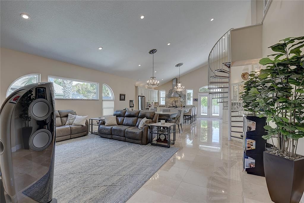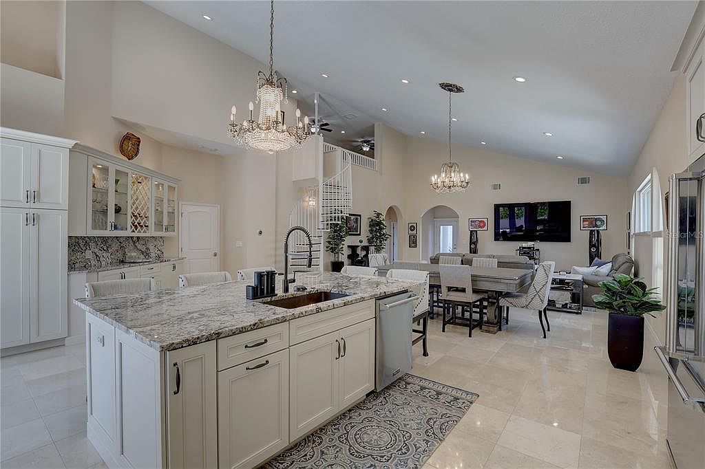 This spacious open concept area combines a modern kitchen with a formal dining and living space, unified by a light neutral color palette. The kitchen features a large island with granite countertops, integrated sink, and built-in dishwasher, accented by white cabinetry with elegant hardware. Above the island, a crystal chandelier adds a touch of luxury. The adjacent dining area contains a sleek table surrounded by upholstered chairs, illuminated by a matching chandelier. Cream marble floors extend throughout, reflecting the ample natural light streaming in from large windows. Architectural elements like a white spiral staircase and arched doorways enhance the room’s grandeur and flow.