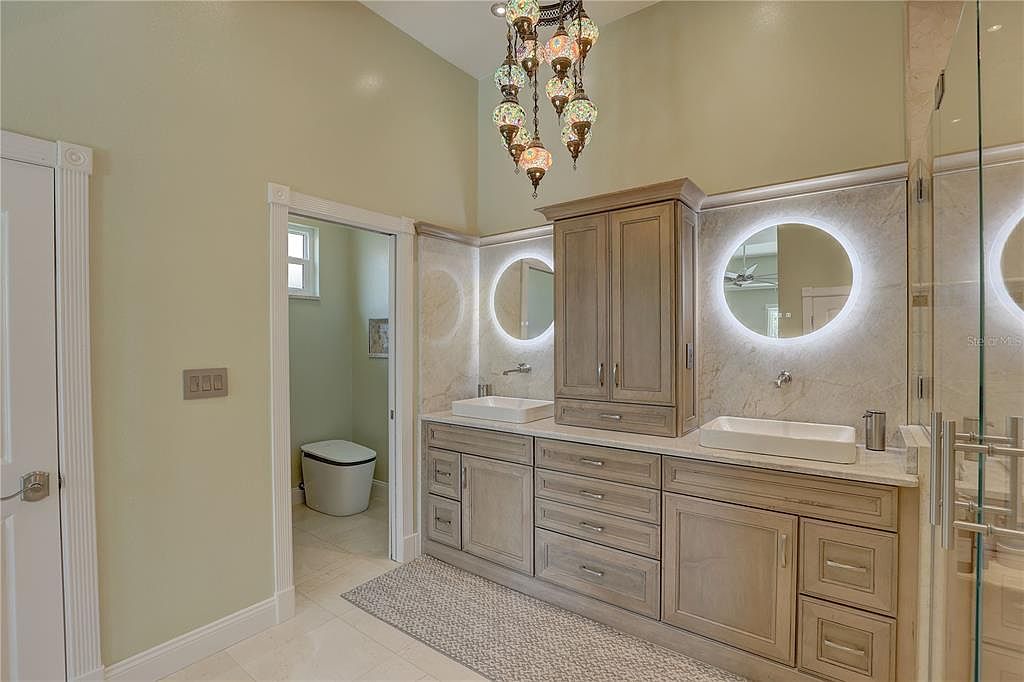 This elegant bathroom features a spacious double vanity with a central cabinet that offers ample storage. Two rectangular vessel sinks sit atop a light stone countertop, complemented by large backlit circular mirrors above each sink, adding a modern touch. The vanity itself is crafted from wood with a weathered finish, balanced by the beige marble backsplash. The floors are polished light tile, enhancing the room’s airiness. A glimpse through the doorway reveals a separate toilet area. A distinctive, multi-colored Moroccan-style chandelier hangs from the high ceiling, adding artistic warmth to the neutral color palette.