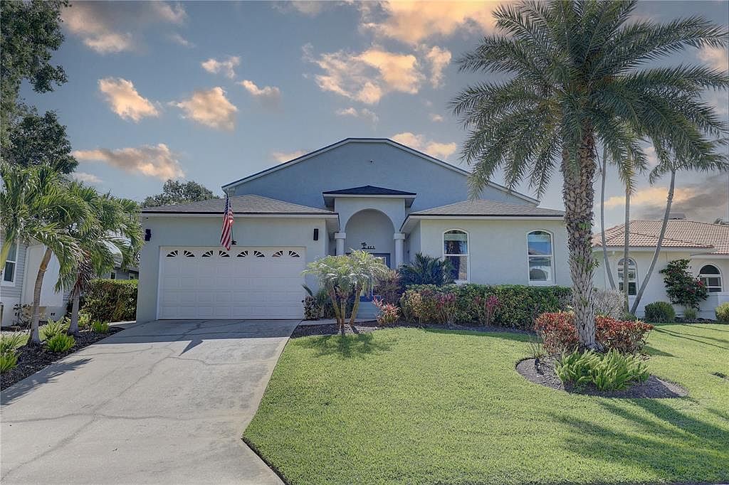 The house presents a welcoming and well-maintained curb appeal with a clean concrete driveway leading to a double garage door featuring decorative window accents. The facade is painted in a soft, neutral tone, complemented by white trim around the windows and entryway. Architectural details include a small covered porch with a curved archway framing the front door. The lush landscaping adds to the tropical ambiance, with a large palm tree and neatly trimmed bushes providing vibrant greenery and various pops of color from flowering plants. The expansive lawn enhances the open, spacious feeling of the exterior.