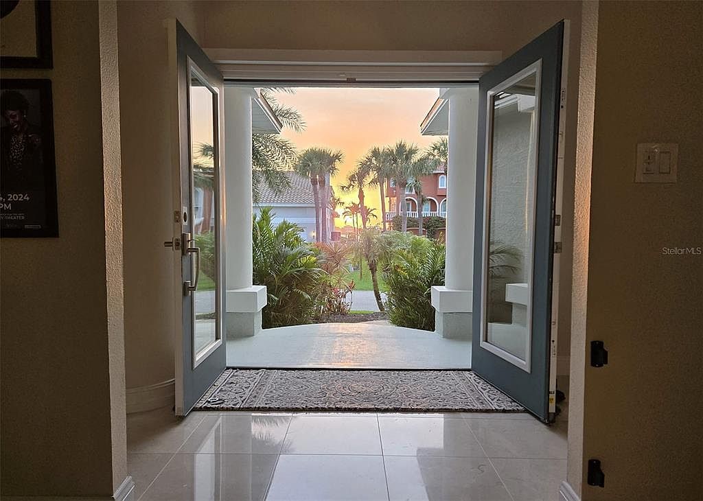 This welcoming front entrance features double doors painted in a muted blue-gray, contrasting softly against the pale beige walls and white trim. Polished, light-colored tile flooring reflects natural light, enhancing the sense of openness. The doorway opens to a covered porch with clean, simple architectural lines. A patterned rug sits just inside, adding texture and warmth. Beyond the porch, lush greenery and tropical palm trees frame a view of a neighboring building with terra-cotta tones, suggesting a warm, coastal or subtropical setting bathed in the golden glow of sunset, inviting relaxation right from the entryway.