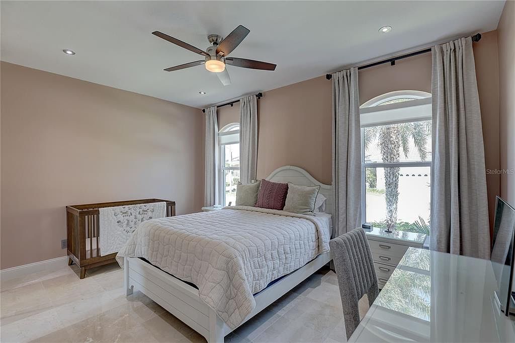 This serene guest bedroom is designed with a neutral color palette of soft beige walls and light cream flooring, creating a calm atmosphere. A white wooden bed with a quilted bedspread anchors the room, complemented by a muted green and dusty rose throw pillows, adding subtle texture and warmth. Two large windows framed with light gray curtains allow natural light to filter through, highlighting the room’s openness. A compact white desk paired with a gray upholstered chair fits neatly by the window. A wooden crib with a decorative baby blanket indicates the room’s multi-functional use, ideal for guests and infants alike. The ceiling fan and recessed lighting complete the fresh, airy feel.
