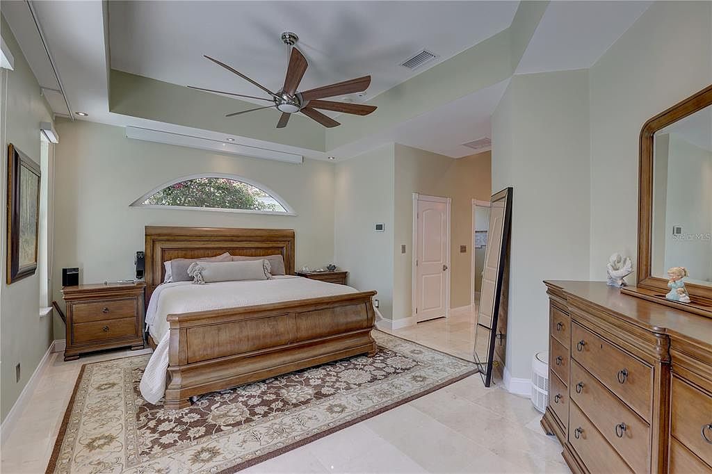 This master bedroom features a spacious and serene layout with a large wooden sleigh bed as the centerpiece, flanked by matching wooden nightstands. The color palette centers on soft greens and neutrals, with light green walls providing a calming backdrop. The ceiling incorporates a tray design with recessed lighting and a striking modern ceiling fan with dark wood blades, adding both style and function. A large traditional rug with floral patterns anchors the bed, complementing the polished stone flooring. A sizable dresser with an elegant framed mirror and a full-length mirror add to the room’s charm and practicality, while an arched window above the bed invites natural light, enhancing the tranquil ambiance.