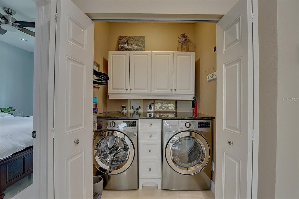 This compact laundry closet is neatly organized with a modern front-loading washer and dryer set in stainless steel finishes. The appliances sit beneath a dark granite countertop that adds sophistication and a durable work surface. Above, white shaker-style cabinets provide ample storage for laundry essentials, while decorative pieces sit atop the cabinets, adding a touch of charm. The closet is framed by dual white paneled bi-fold doors that open to reveal the space, integrating it subtly into the home. The warm beige walls create a cozy backdrop complementing the clean, functional design of the laundry area.