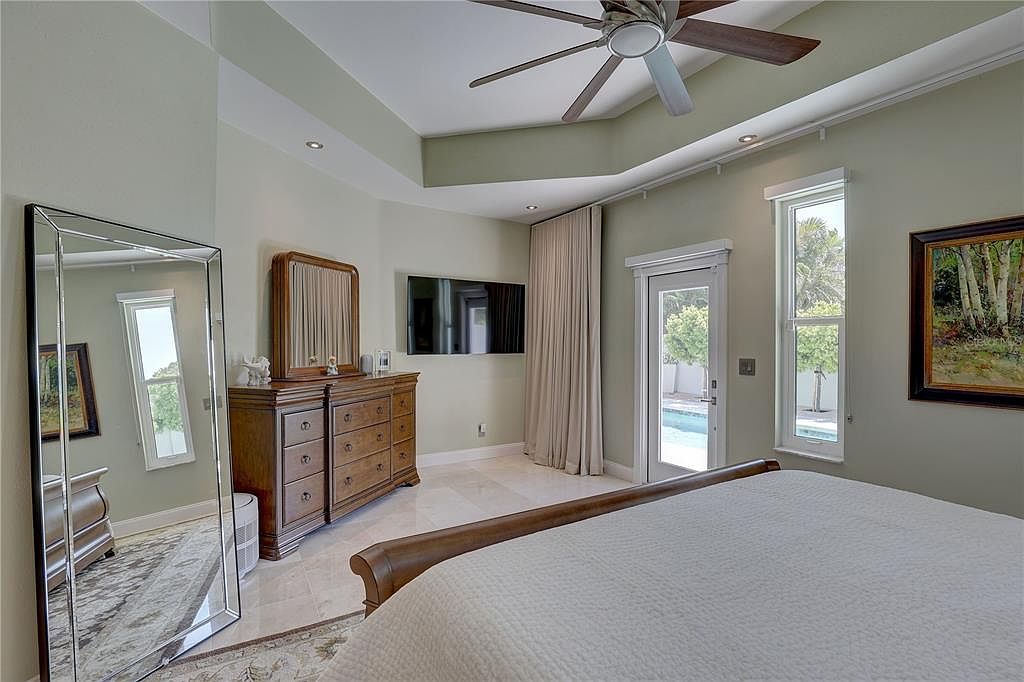 This serene bedroom features soft, muted green walls that harmonize with the natural wooden tones of the sleigh bed and the matching dresser set. The room’s architecture highlights a tray ceiling with recessed lighting and a stylish ceiling fan with wood blades, adding a traditional yet modern touch. A large full-length mirror leans against the wall beside a wooden dresser with a matching framed mirror. Natural light floods through tall narrow windows and a glass door that opens directly to an inviting pool area, enhancing the airy, tranquil ambiance. The light floor tiles and neutral curtains create a calm, cohesive environment bolstered by tasteful artwork.