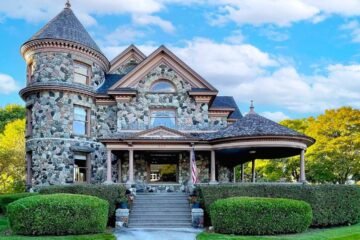 Intricate murals, hand-carved woodwork, and leaded glass windows define this majestic Victorian stone home with stunning Lake Huron views.