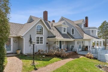 The home features custom wood moldings and a steep gabled roofline, alongwith recent updates including new electrical, plumbing, and HVAC system.