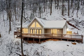 Tour this 1,320 sq. ft. mountain modern home in Bryson City, NC, featuring a hot tub, fire pit, and cozy design perfect for scenic mountain living.