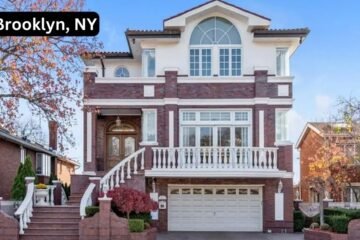 A stunning three-story brick home in Brooklyn, NY, featuring arched windows, a grand staircase, and an elegant balcony, showcasing classic architectural charm.
